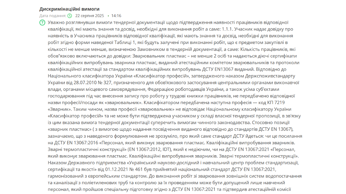 Однак тендерна документація вже викликала зауваження учасників через встановлені дискримінаційні вимоги. Зокрема, замовник вимагає наявність не менше двох зварювальників пластмас із сертифікатами кваліфікаційних випробувань, виданих атестаційним комітетом зварників. Учасники звертають увагу, що така вимога суперечить чинному законодавству, адже професія “зварювальник пластмас” відсутня у Національному класифікаторі України та не передбачає обов’язкової сертифікації через атестаційні комітети.