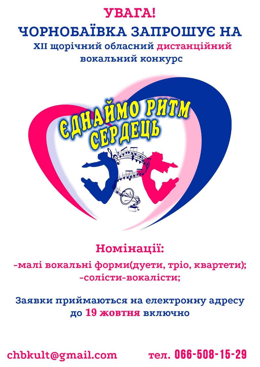 Чорнобаївська громада оголошує про проведення XII щорічного обласного дистанційного вокального конкурсу “Єднаємо ритм сердець”. До участі запрошуються солісти та малі вокальні колективи, такі як дуети, тріо та квартети.