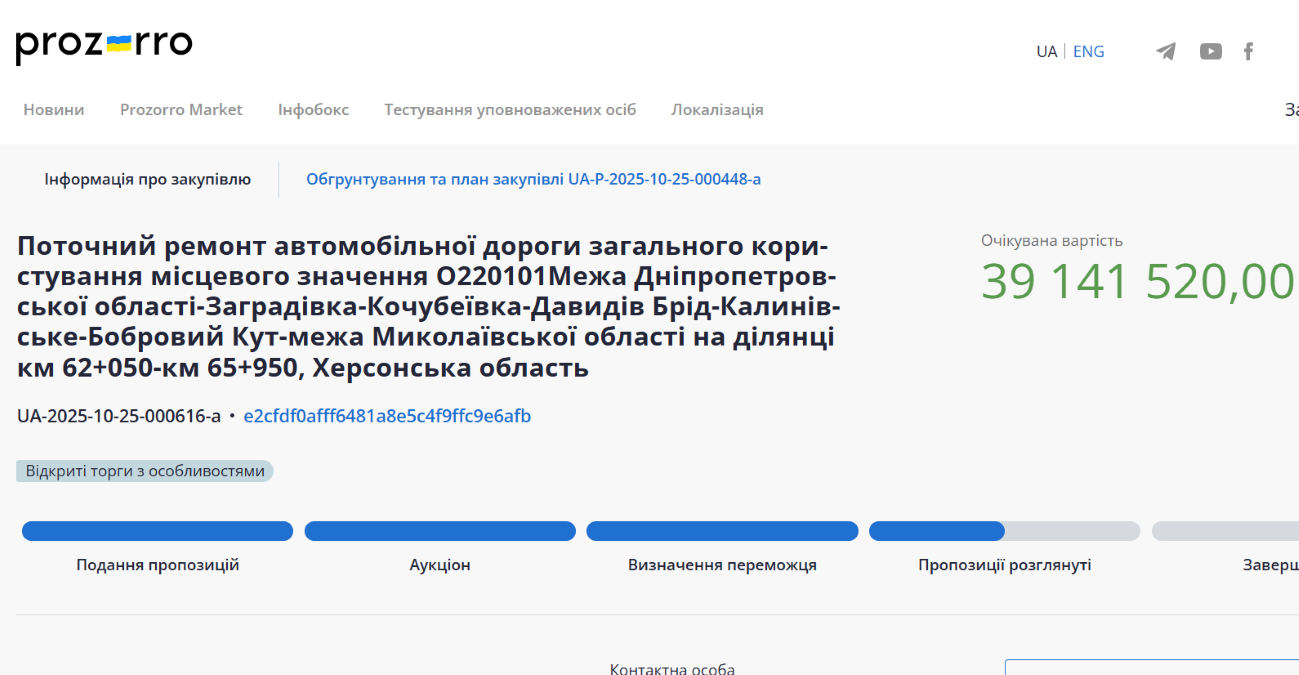 У жовтні 2025 року державна установа “Місцеві дороги Херсонщини” оголосила два відкриті тендери на загальну очікувану вартість 56,8 мільйонів гривень.