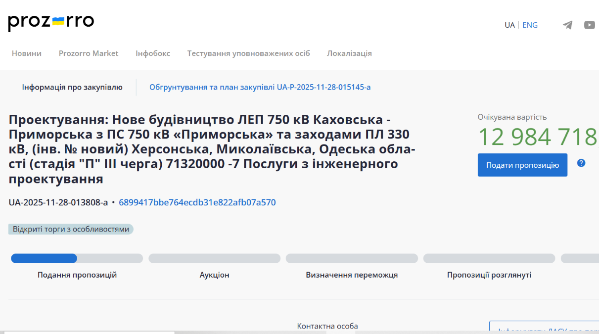 Перший тендер стосується п’ятої черги проекту на стадії “П”, а очікувана вартість послуг складає 10,2 мільйона гривень.